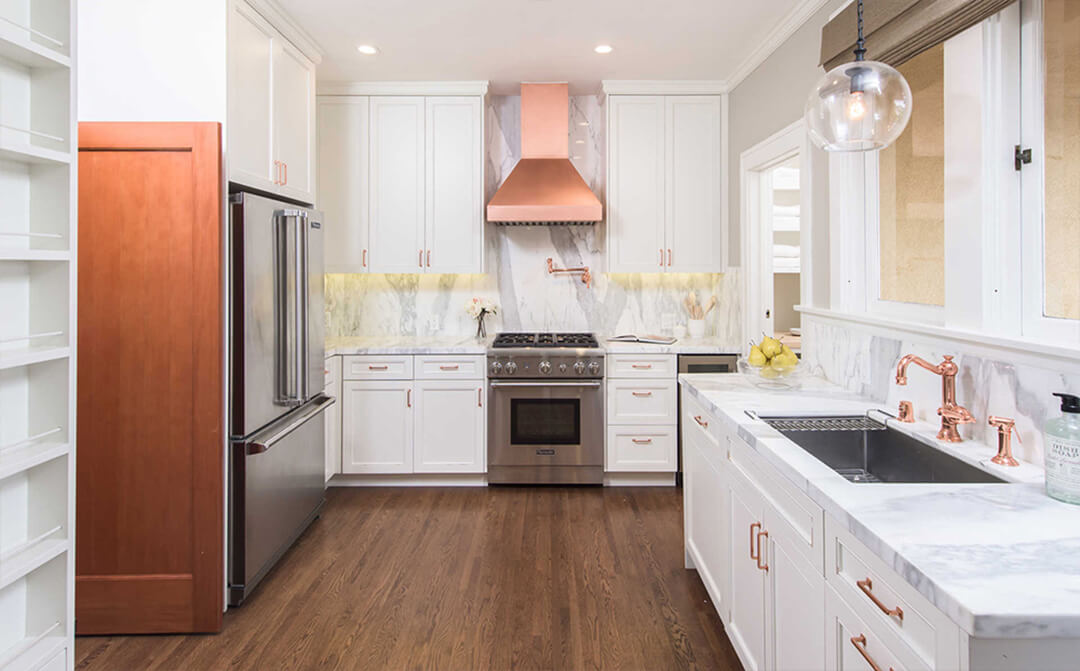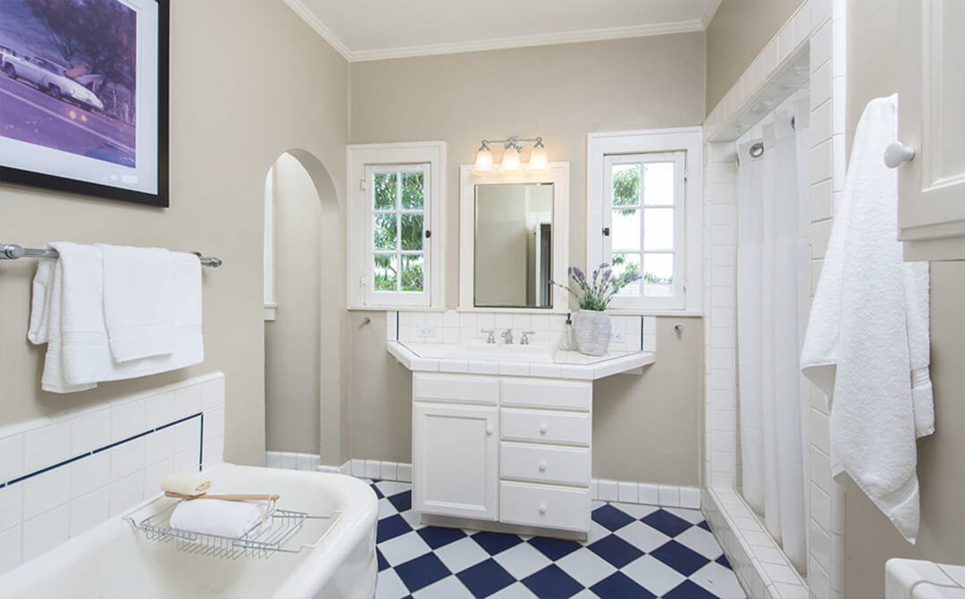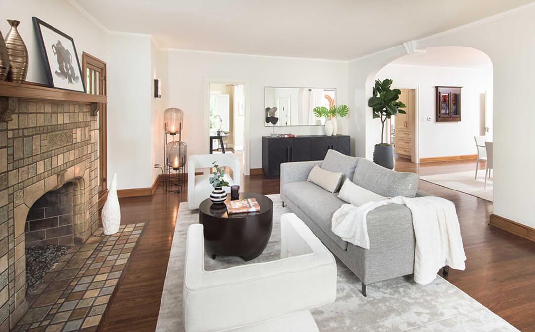The main living areas showcase medium brown stained oak floorboards, reinforcing the home’s warmth and period authenticity. The living room centers around an original large-scale Batchelder tile fireplace, a highly sought-after feature in early 20th-century Southern California homes.