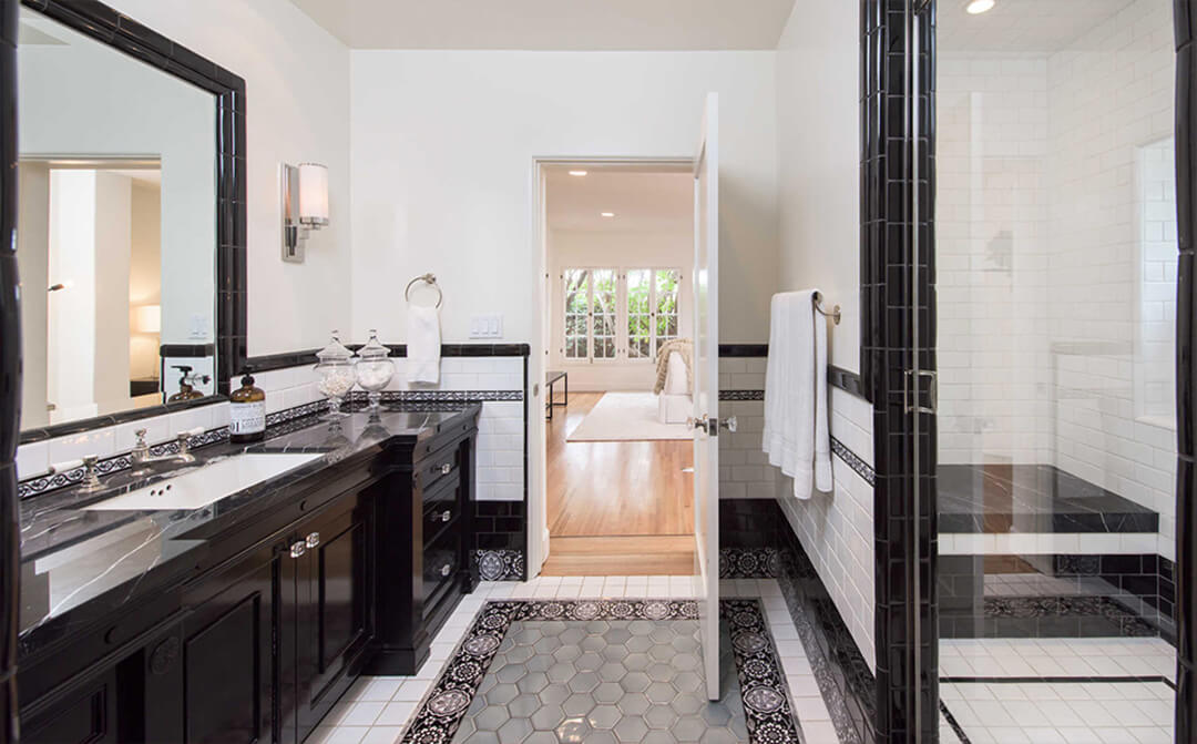 The dining room includes soaring windows that create an open, airy feel. On the lower level, the primary suite offers oversized eight-pane casement windows, a walk-in closet, and a vintage-style black-and-white tiled bathroom accented by a black marble vanity.