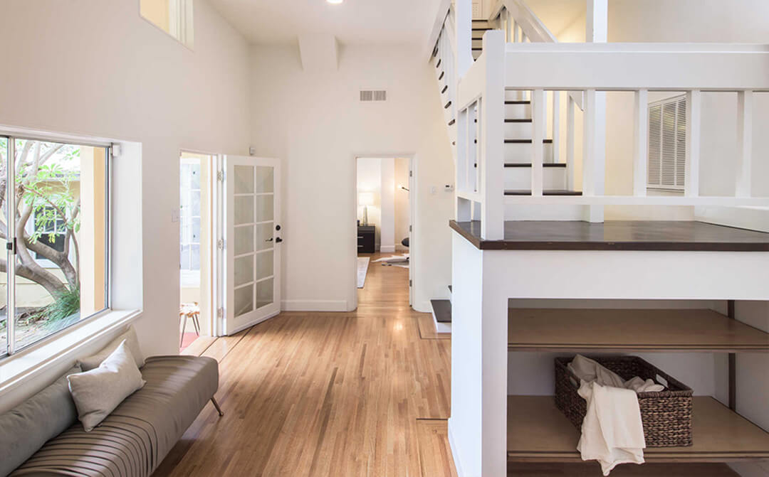 The home features an upside-down layout, a design approach often seen in hillside neighborhoods throughout Los Angeles. In this configuration, the main entrance and entertaining spaces sit on the upper level, while bedrooms are positioned below for added privacy.
