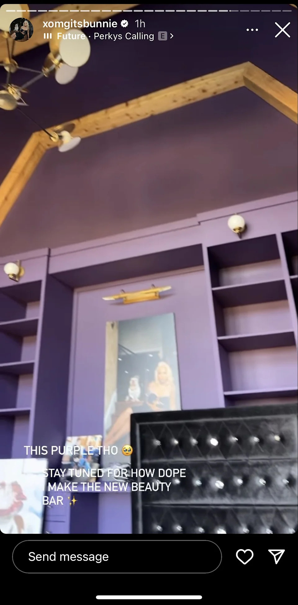 Bunnie XO led the design herself, rejecting the neutral-heavy celebrity look in favor of something darker, bolder, and way more personal. The walls are drenched in Vogue Green, a deep emerald that makes the entire space feel moody but grounded. Other rooms lean into purple tones and black lace textures, which is how the “Harley Quinn Lair” nickname stuck.