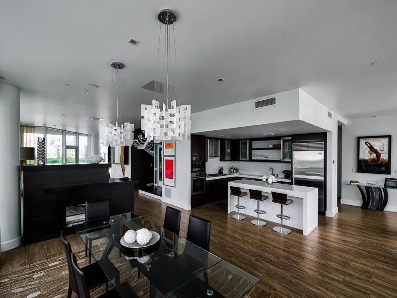 The bi-level layout effectively doubled the usable living area by creating distinct zones within the same unit. The upper level housed the primary entertaining spaces and the chef-grade kitchen, while the lower level contained the bedrooms, bathrooms, and more private family areas. This separation allowed Embiid to maintain a clear boundary between his public-facing entertaining spaces and his personal retreat — a surprisingly thoughtful design choice for a single professional athlete.