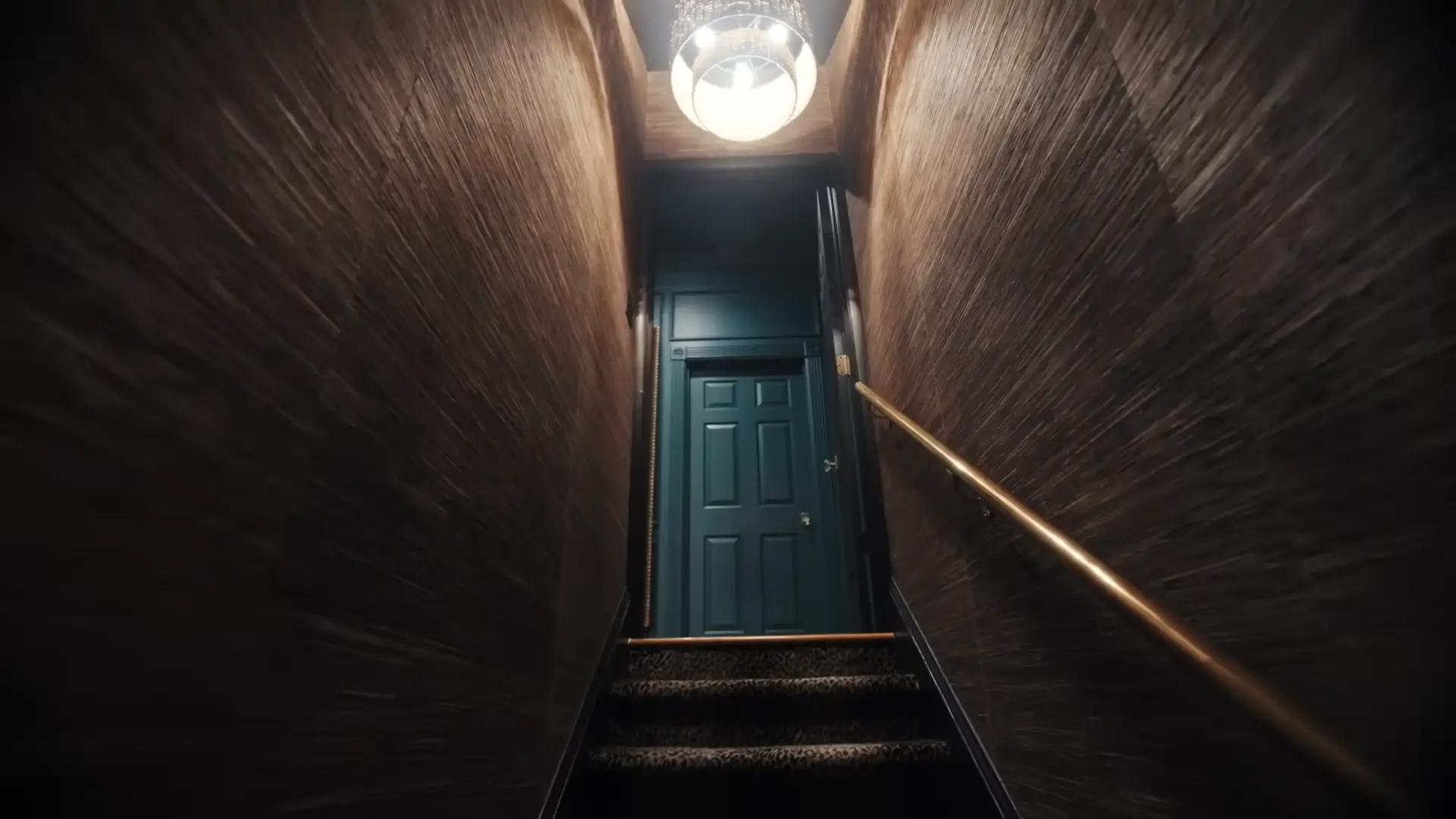 The entry makes a confident statement. A glittering gold ceiling crowns the space. The textured wallpaper resembles stacked gold records, immediately reinforcing her identity as a hitmaker.