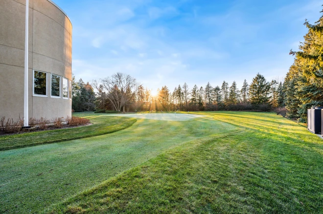 The estate’s exterior is a sprawling Mediterranean-influenced stucco structure with terra-cotta roofing. From the air, the property reveals its full scale: a main house ringed by a tennis court, putting green, and a circular infinity pool with a grass island at its center. The 7-acre lot borders a lake, providing a sense of seclusion that’s rare in the suburban North Shore market.