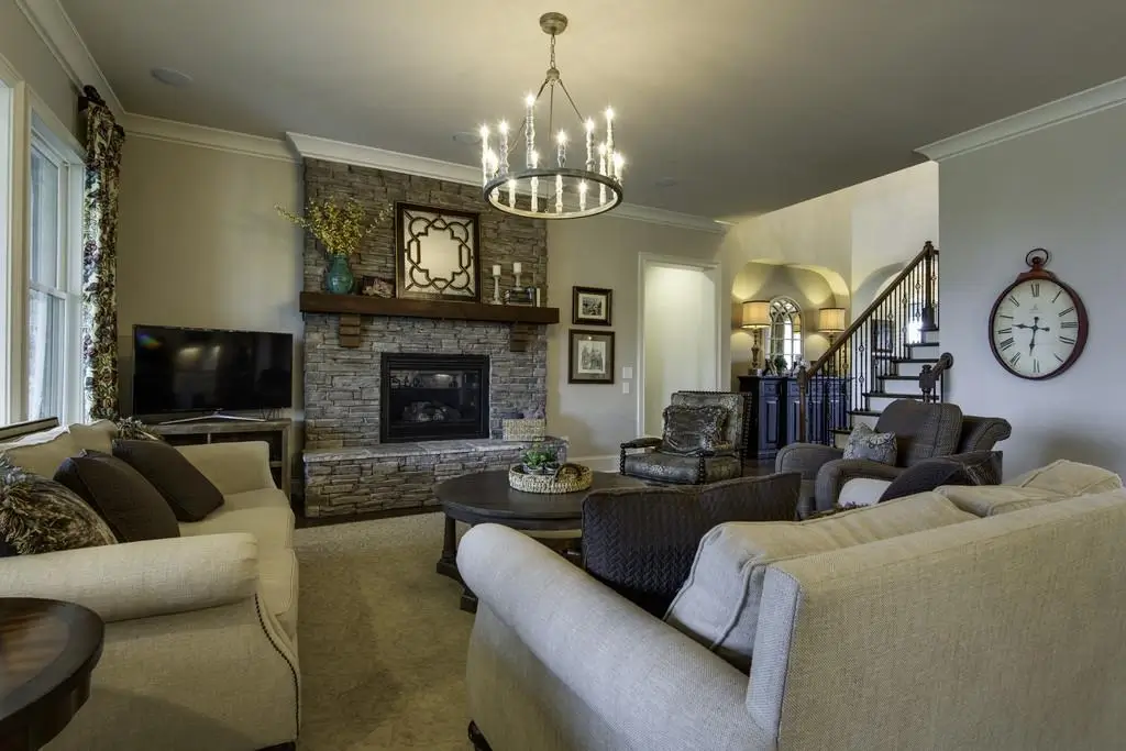 - Stone fireplace anchoring the main room