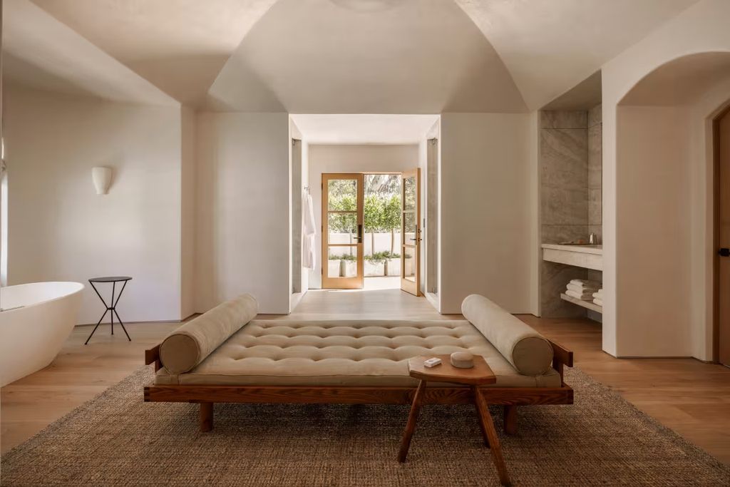 From a material standpoint, this is a smart design strategy. Neutral, warm-toned finishes age well and provide a versatile backdrop for any future furnishing choices. The arched inset porches connect the interior to the landscape seamlessly, which is a hallmark of quality California residential design—blurring the boundary between indoor and outdoor living.