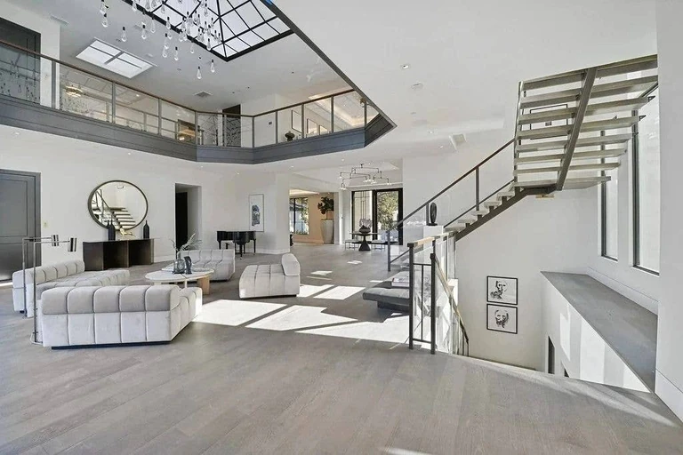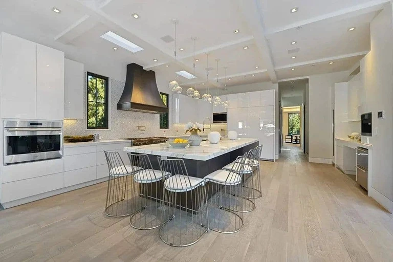 The kitchen serves as the home’s social hub, connecting to open-plan living areas where the family spends most of their time. The design avoids the cold minimalism that plagues many mega-mansions, instead favoring layered warmth — wood beams, linen upholstery, and curated ceramics that make 17,000+ square feet feel livable rather than institutional.