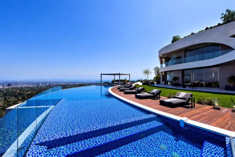 Large glass openings allow the main living areas to spill onto terraces without a visual break. The star feature is the approximately 75-foot infinity pool, positioned to pull the skyline into the property rather than block it.