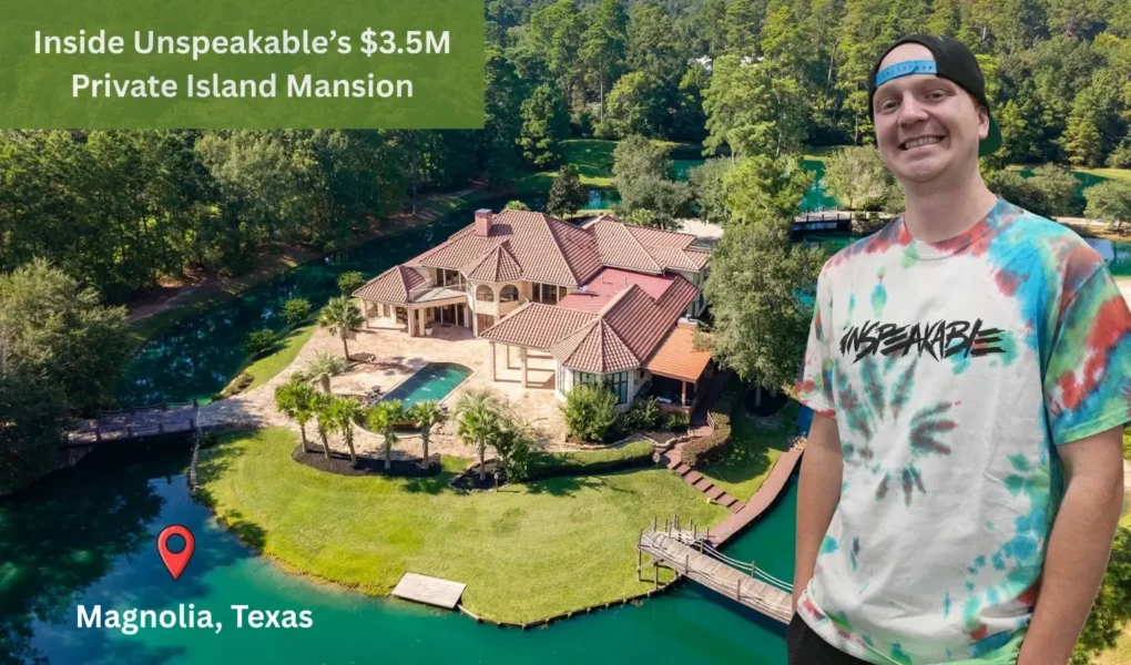 Unspeakable (Nathan Graham) has transformed YouTube challenges into a full-scale entertainment business. That success is most visible in where he lives today: a secluded, moat-style mansion near Houston that fans often call his “private island house.” As of 2025, this Magnolia, Texas property remains his primary residence and the creative hub behind many of his viral projects.