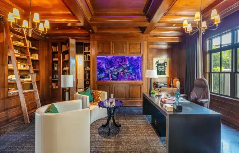 Integrated into the wood-paneled library is a massive 800-gallon saltwater aquarium originally built for Matthews and featured on the television show Tanked. It is a rare architectural feature that turns a study into a statement room.